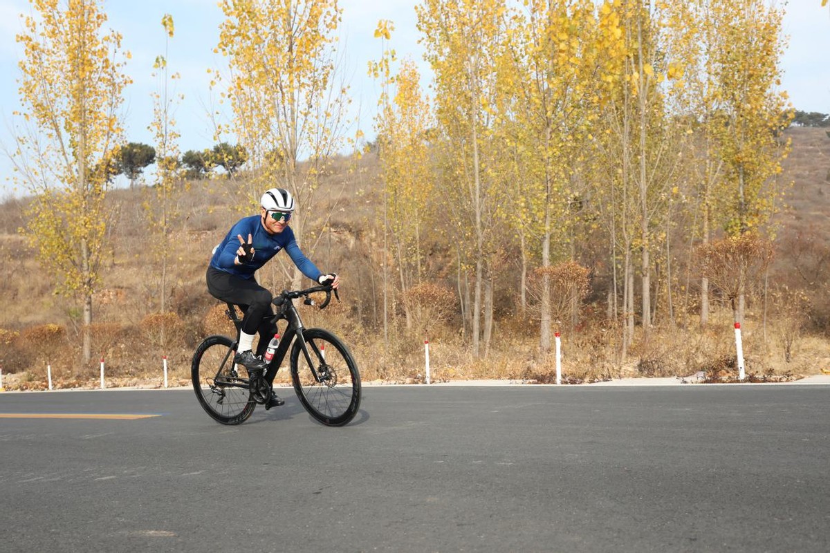 11月15日,在河北省唐山市丰润区潘马公路,骑行爱好者向镜头比耶。 (记录者:朱大勇)